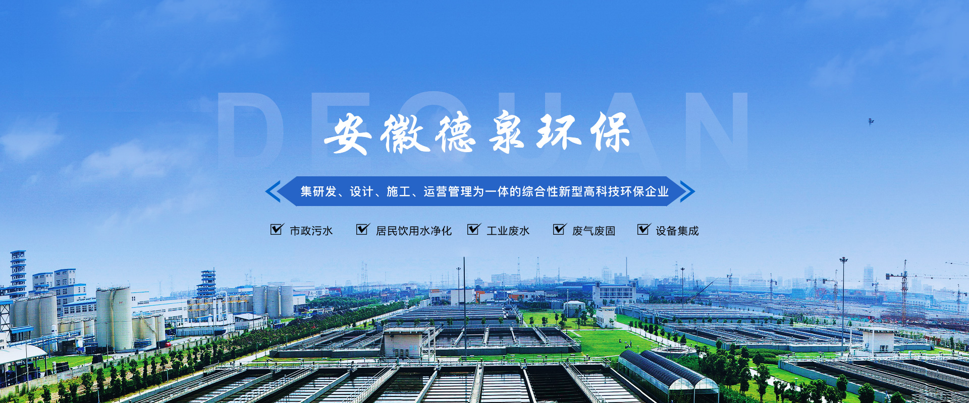 安徽德泉環(huán)保科技有限公司致力于廢水、廢氣、固廢技術處理研發(fā)、設計、施工及運營管理,從事環(huán)保設備及設施的制造和銷售,為環(huán)保項目系統(tǒng)提供專業(yè)的技術咨詢和服務。是一家集建筑勞務分包,工程總承包(EPC)、項目投資(BOT/PPP)、運營管理(O&M)于一體的綜合性新型高科技企業(yè)。